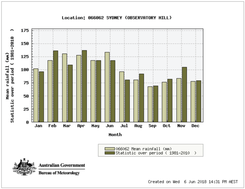 The following data as been taken from the Bureau of Meteorology and shows the average monthly rainfall along with the minimum and maximum temperatures.