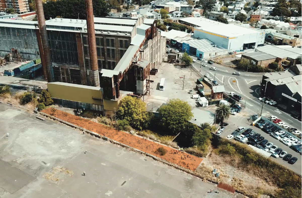 Along with the building the site was bordered to the north-west by the former settling & cooling ponds and rail yards, which were overgrown with vegetation. The southern and eastern sides were defined by a concrete retaining wall and stormwater drainage channel adjacent to an immense concrete hard stand and harbour beyond.